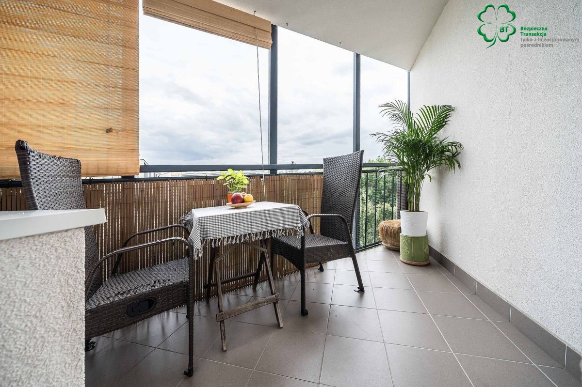 • balkon, szeroki( trójkątny) z przyjemnym widokiem na zieleń
