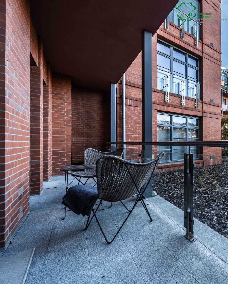 Na całej szerokości apartamentu balkon z widokiem na piękny, całorocznie zadbany dziedziniec ogrodowy.