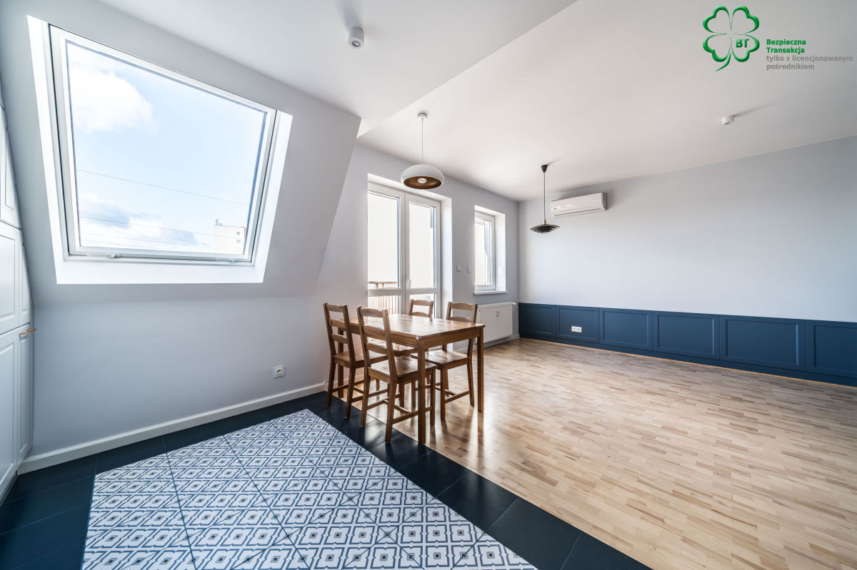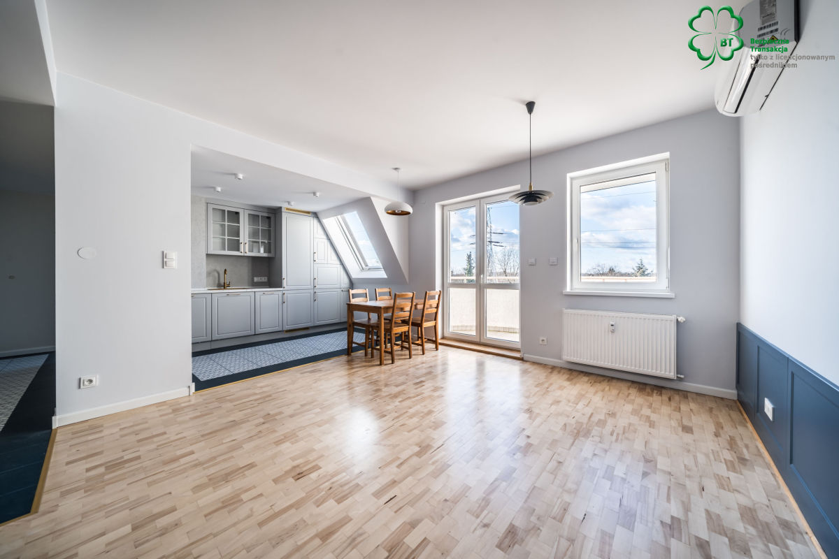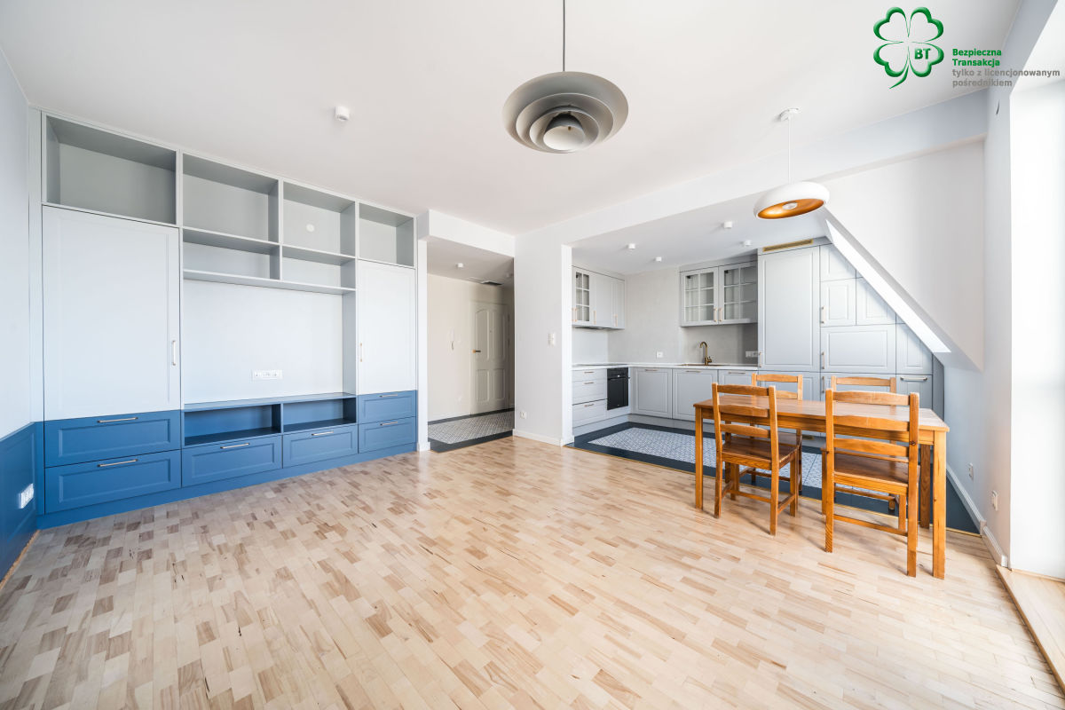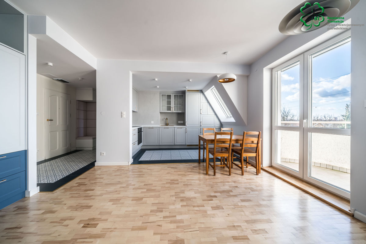 -salonu z aneksem kuchennym i częścią jadalną z wyjściem na duży balkon, z którego rozpościera się nietuzinkowy widok na dzielnicę